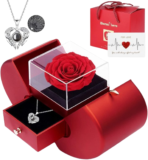 Experience the magic of timeless affection with our Preserved Real Rose and “I Love You” Necklace in 100 Languages. This exquisite set pairs the natural beauty of a perfectly preserved rose with the technological charm of a necklace that, when held up to the light, projects the phrase “I love you” in 100 different languages.